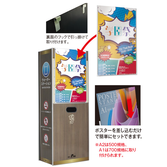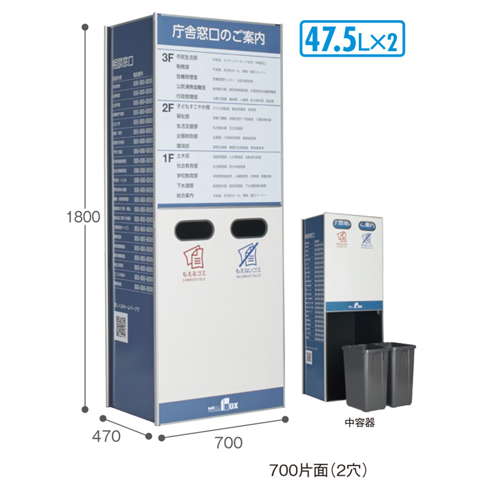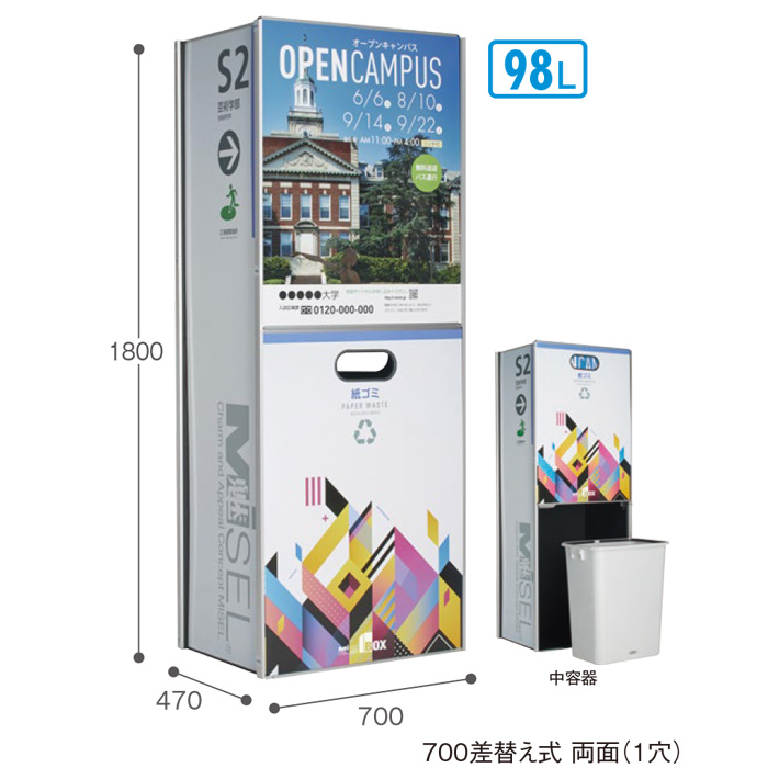 | 備考 | ●価格はシート印刷・貼り工賃を含みます。 ●受注生産品です。受注後約1週間で出荷します。(ご注文状況により、納期が変動する場合があります) ●差替えボードは別途お買い求めください。 ●この商品は屋内用です。屋外や高温になる場所には設置しないでください。 ●中袋には500:ポリ袋110Gまたはエコ再生100%ゴミ袋(別売)または市販の90L用ポリ袋、700:専用中袋L(別売)または市販の70L用ポリ袋が使用できます。 ●記載の重量に中容器は含まれていません。 |